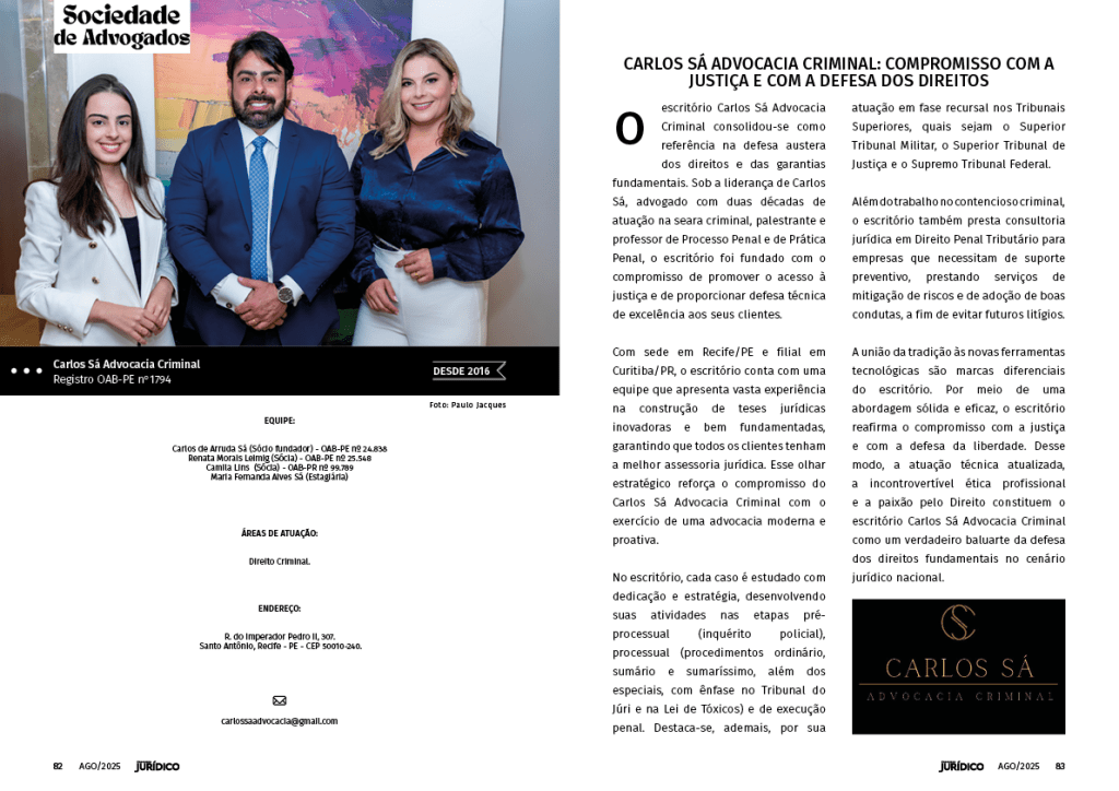 Com sede em Recife/PE e filial em Curitiba/PR, o escritório conta com uma equipe de vasta experiência. Principalmente, na construção de teses jurídicas inovadoras e bem fundamentadas. Dessa forma, garante que todos os clientes tenham a melhor assessoria jurídica. Nesse sentido, esse olhar estratégico reforça o compromisso do Carlos Sá Advocacia Criminal com o exercício de uma advocacia moderna e proativa.